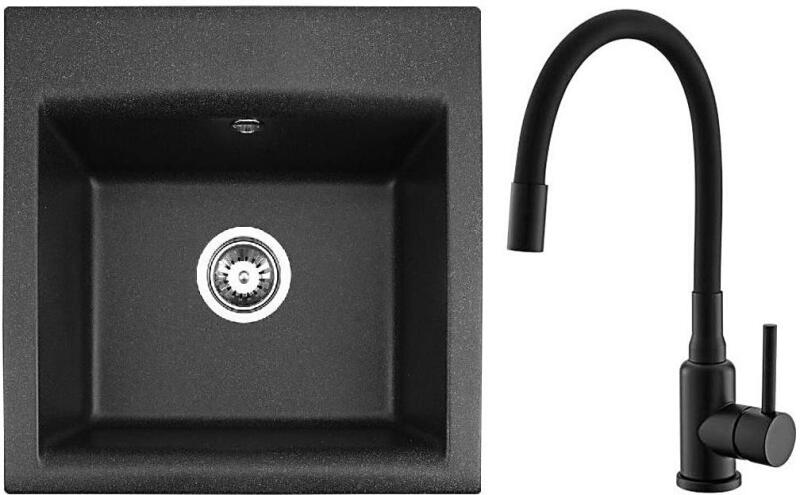 Konyhai mosogató modern csapteleppel. Konyhai mosogató ATROX: Kiváló minőségű gránitból készült, amely ellenáll a karcolásoknak, a foltoknak és a magas hőmérsékletnek. Egy medencés kialakítás, amely elegendő helyet biztosít az edények mosásához. Kézi leeresztő vezérlés - a lefolyódugó a szűrő megnyomásával záródik és nyílik. A túlfolyó a mosogató medencéjében található. Csaptelep furat nélkül. Méretek: 18 x 50 x 50 cm. MINTAS mosogató csaptelep: Egykaros konyhai csaptelep nagy nyomású működéssel és forgatható kifolyóval. Lehetővé teszi a víz hőmérsékletének és áramlásának egyszerű, fokozatmentes beállítását. Gyakorlati, rugalmas kifolyókar. 35 mm szabványos furatba szerelhető. Méretek: 34 x 21 x 4,9 cm. A csomag tartalma: gránit mosogató, szűrős lefolyó 3 1/2, szifon mosogatógép-csatlakozással, mosogató csaptelep, csatlakozó tömlők, szerelőkészlet.
