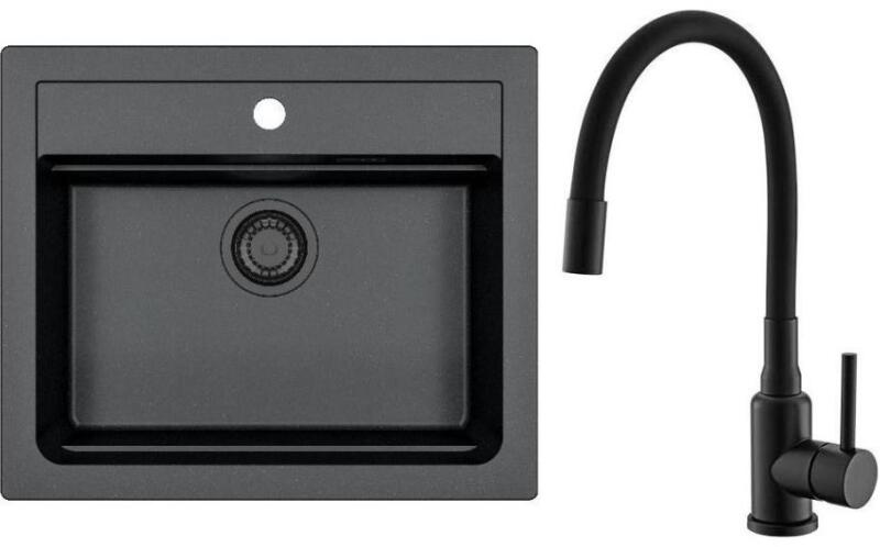 Konyhai mosogató modern csapteleppel. ATROX konyhai mosogató: Kiváló minőségű gránitból készült, amely ellenáll a karcolásoknak, foltoknak és a magas hőmérsékletnek. Egy medencés kivitel, amely elegendő helyet biztosít az edények mosásához. Kézi leeresztő működtetés – a leeresztő a szűrő benyomásával záródik és nyílik. Túlfolyó a mosogatómedencében található. Csaptelep számára előkészített nyílással. Méretek: 19,5 x 59 x 50 cm. MINTAS mosogatócsaptelep: Egykaros, nagy nyomású konyhai csaptelep forgatható kifolyóval. Egyszerű és folyamatos hőmérséklet- és vízáram-szabályozást tesz lehetővé. Praktikus, flexibilis kifolyócső. Szerelés szabványos, 35 mm-es nyílásba. Méretek: 34 x 21 x 4,9 cm. A csomag tartalma: gránit mosogató, rögzítőelemek, 3 1/2-es szűrős leeresztő, szifon mosogatógép-csatlakozással, mosogatócsaptelep, csatlakozó tömlők, szerelőkészlet.
