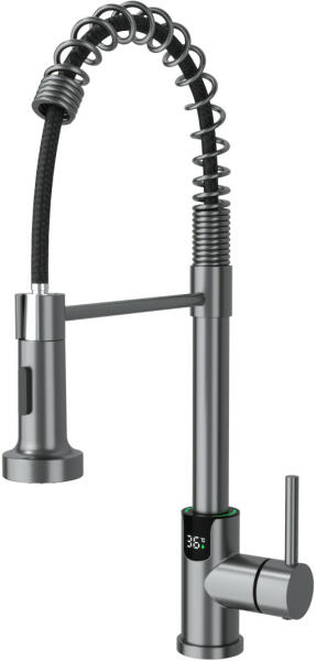 AUSTLER FH-3113 intelligens mosogató csaptelep, ami egy modern smart csapteleppel szembeni minden követelményt magasan teljesít. A modern design és a konyhában szükséges funkciók teljes tárháza egyesül az Austler mosogató csaptelepek minden modelljénél. A legújabb innovációkat magában foglaló csaptelep a kiemelhető fejjel a normál kifolyás mellett vízesés üzemmódban is működik, ami a digitális vízhőfok kijelzővel kiegészítve megkönnyíti a konyhai műveleteket. Digitális hőmérséklet kijelző: a pontos vízhőmérséklet a csaptelep alsó részén kialakított kijelzőn látható. Elektromos áramigény mentes: a beépített egyenáramú generátor a vízfolyás energiáját felhasználva termeli meg a digitális kijelző számára szükséges elektromos áramot, ami csak használat közben aktív. 2 vízfolyás üzemmód: