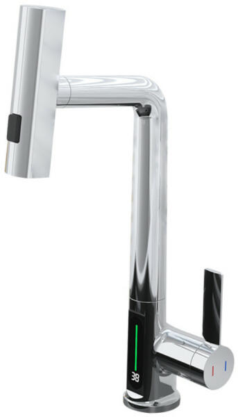 AUSTLER FH-3428-5 intelligens mosogató csaptelep, ami egy modern smart csapteleppel szembeni minden követelményt magasan teljesít. A modern design és a konyhában szükséges funkciók teljes tárháza egyesül az Austler mosogató csaptelepek minden modelljénél. A legújabb innovációkat magában foglaló csaptelep az elfordítható fejjel vízesés üzemmódban is működik ami a digitális vízhőfok kijelzővel megkönnyíti a konyhai műveleteket. Digitális hőmérséklet kijelző: a pontos vízhőmérséklet a csaptelep alsó részén kialakított kijelzőn látható, ami mellett a víz hőmérsékletét és intenzitását egy függőleges diagram is mutatja. Elektromos áramigény mentes: a beépített egyenáramú generátor a vízfolyás energiáját felhasználva termeli meg a digitális kijelző számára szükséges elektromos áramot, ami csak használat közben aktív. 3 vízfolyás üzemmód: