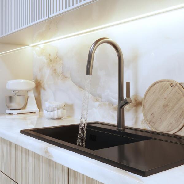 Az Awra konyhai csaptelep kihúzható kifolyóval és kettős funkciójú kézi szeleppel a modern dizájnt és a funkcionalitást ötvözi, hogy leegyszerűsítse a mindennapi konyhai feladatokat. A rugalmas, kihúzható kifolyóval ellátott vízsugár könnyen irányítható, így különösen hasznos nagy edények megtöltéséhez, zöldségek öblítéséhez vagy a mosogató tisztításához. A kettős funkciójú kézi szelep lehetővé teszi a klasszikus vízsugár és a zuhanyfunkció közötti egyszerű váltást, növelve a kényelmet és vizet takarítva meg. Az ergonomikus fogantyú biztosítja a hőmérséklet és a nyomás sima beállítását, míg a robusztus konstrukció tartósságot és megbízhatóságot biztosít az elkövetkező évekre. Az Awra modell tökéletes választás a modern konyhákba, ahol az esztétika és a praktikum egyaránt fontos. Awra konyhai csaptelep gun grey, beépíthető