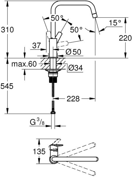 • Elfordítható magas kifolyó - Elfordítási szög 150°